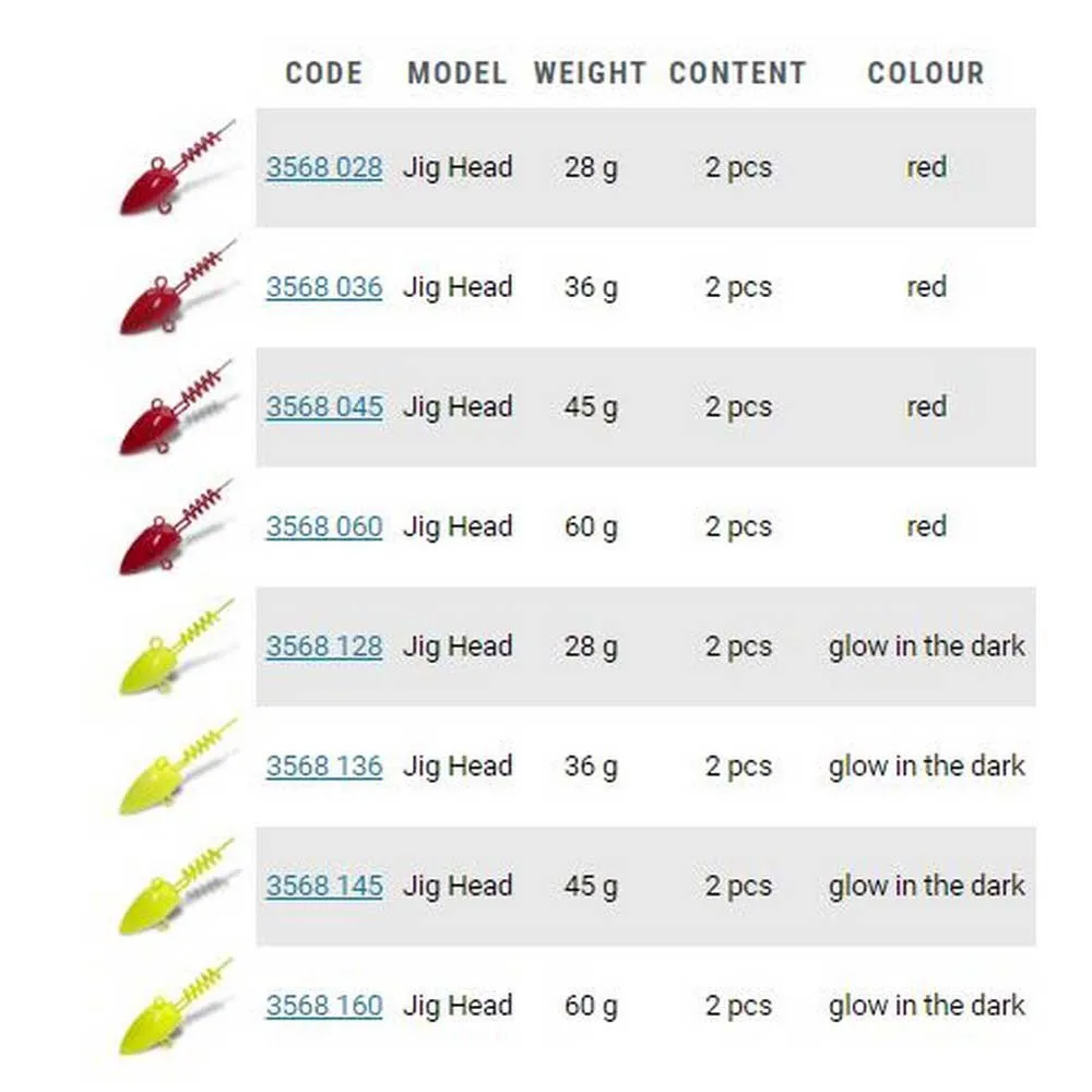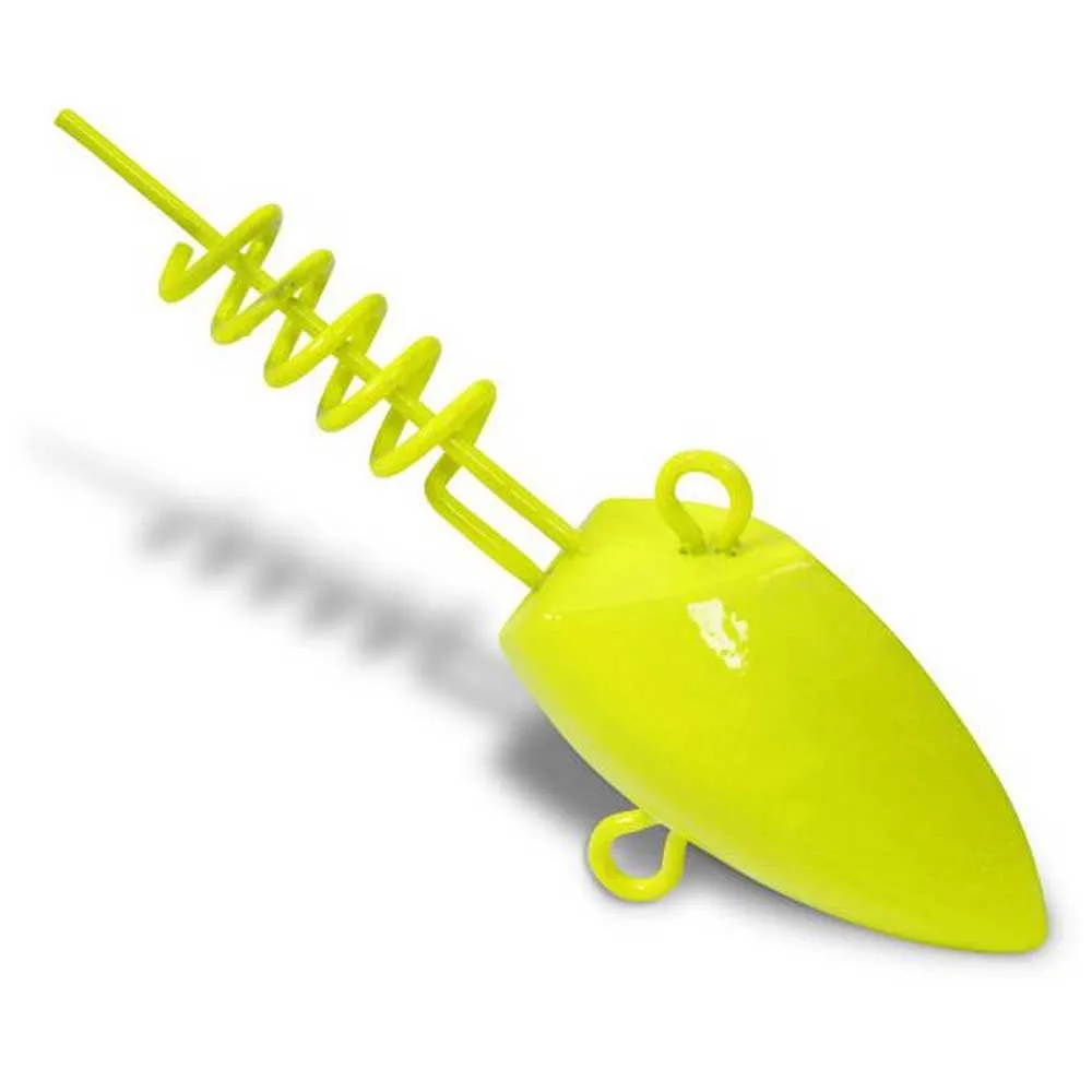 Jig head with screw spiral for use with all common soft lures. The special head design allows the lure to glide through the water in a straight line on the retrieve and to sink rapidly. The jig head can be used for spinning and vertical fishing. The jig head features a strong eye for attaching the main line and stinger.