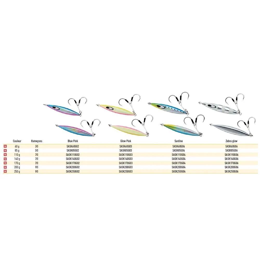 This tapered jig boasts a centred balance which makes it ideal for slow jigging on the bottom. This design lets it get down to the deck without losing time or getting carried away in the current. It behaves like a typical slow jig (butterfly style) on vertical animations and especially on the release. Supplied with a double assist on strong braid with VMC 7264 hooks.