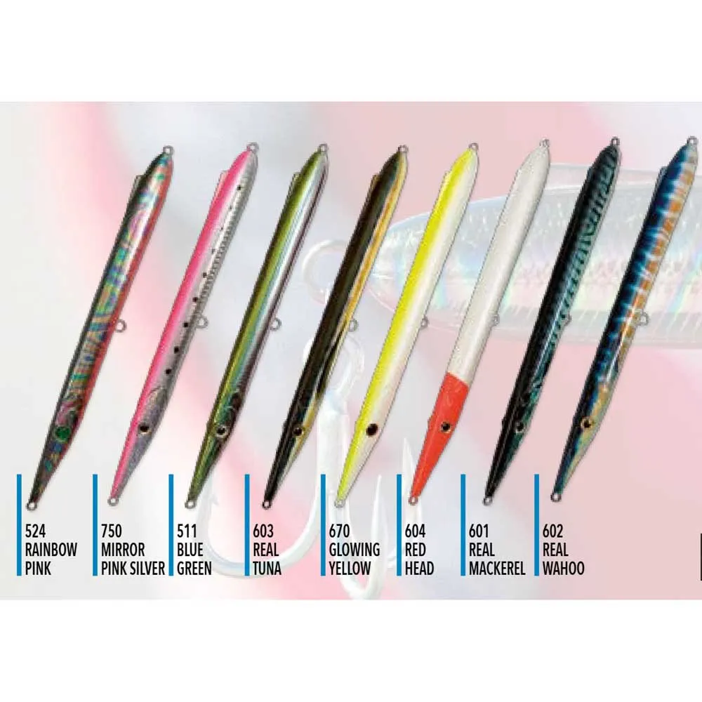 This lure perfectly imitates a needlefish and is characterized by an extremely realistic swim- ming action. The special rear fin allows sta-