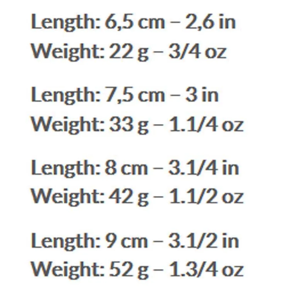 Comparing the weights the Jugulo FS has a smaller size, it increases the attractive power of the bait when predators are very selective and in used to hunt small fishes or forage fish.