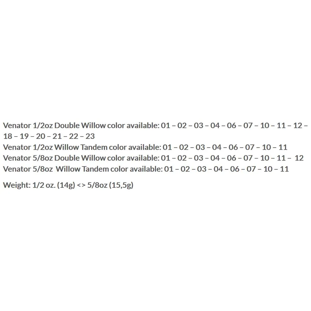 Venator 1/2oz Double Willow color available: 01 – 02 – 03 – 04 – 06 – 07 – 10 – 11 – 12 – 18 – 19 – 20 – 21 – 22 – 23