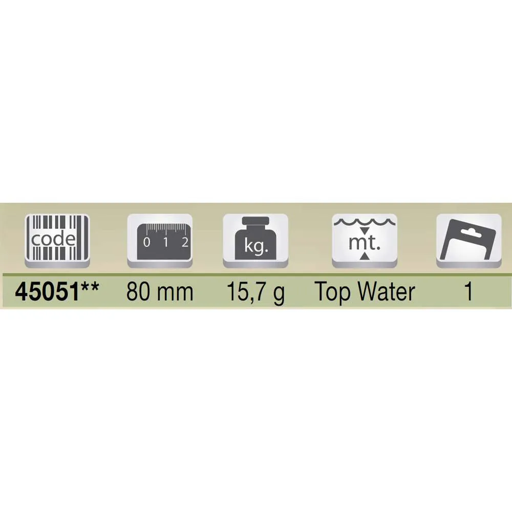 This popper responds very well to jerk it is ideal for “walking the dog“ retrieve. Volume of water moved during action produces a turbulent trail thanks to its lateral openings place inside the mouth. Ideal for all surface predators.